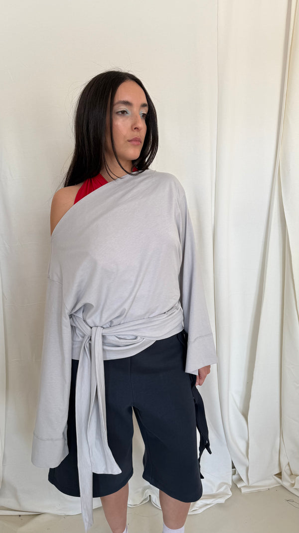Lightweight wrap sweatshirt with wide sleeves, allowing you to shape it in different ways for a unique look. Can be tied fitted or loose for varied silhouettes. Wear it upside… Read more